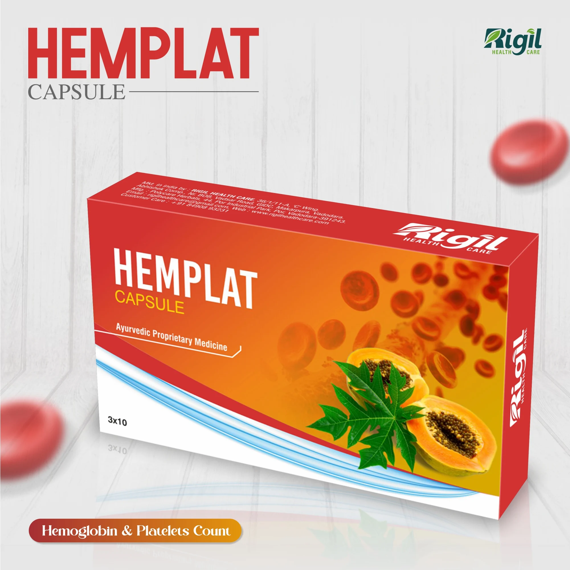 Hemplat Capsule is a powerful Ayurvedic formulation designed to enhance hemoglobin and platelet levels while improving overall blood quality. This supplement works by increasing the body’s ability to produce healthy red blood cells and platelets, which are vital for maintaining energy levels and ensuring efficient oxygen transport. Its antioxidant properties help protect the cells from oxidative stress, reducing the harmful effects of free radicals, while simultaneously boosting vitality and rejuvenating the body.