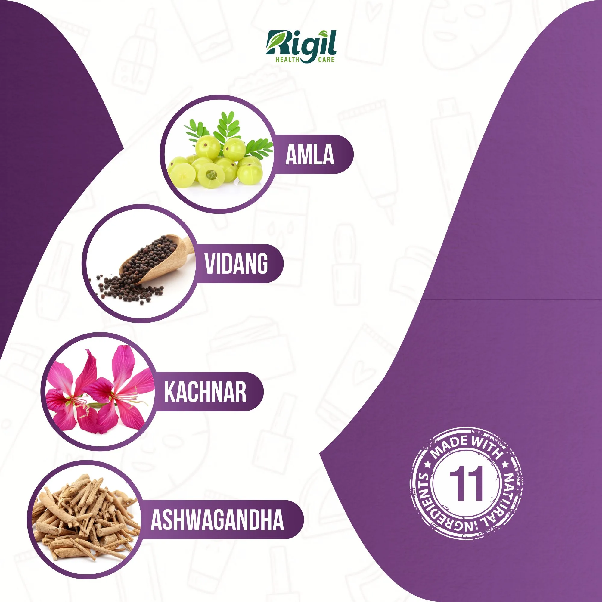 • Made with ayurvedic ingredients like Amla, Vidang, Aswagandha, and many other.