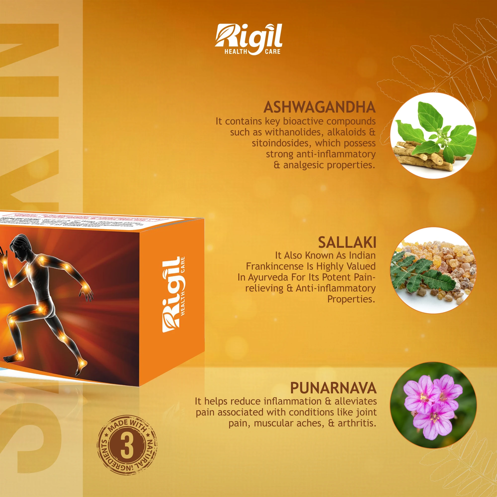 - Made with natural herbs like Sallaki, Ashwagandha and Punarnava.